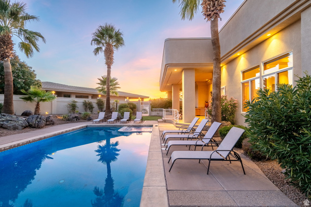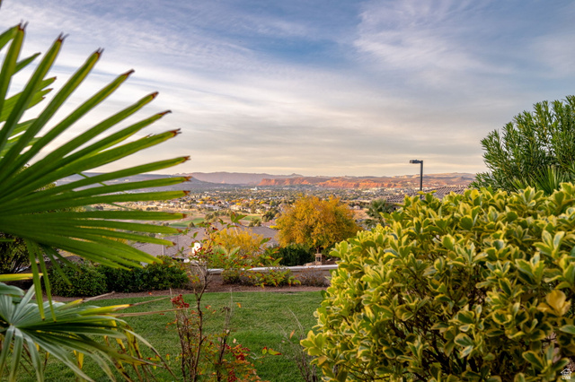Custom 7,760 SF Home with Panoramic Mountain, Temple & City Views! Elevated high above the valley, this custom home captures sweeping unobstructed views of the entire city of St. George, Pine Valley Mountains, red sandstone cliffs, St. George Temple & golf course! Designed to showcase the scenery from every room, it features dramatic windows, 16-foot coffered ceilings, marble floors, and open living spaces ideal for entertaining or relaxing in comfort. The gourmet kitchen offers custom cabinetry, granite countertops, double ovens, & a built-in refrigerator w/dual freezer and refrigerator drawers. The primary suite frames the mountain and temple views perfectly, while the walkout basement adds a full second living area with theater, wet bar, and custom built-ins. Outside, a private pool w/rock waterfall and dolphin statues creates a serene, resort-style retreat! Outdoor built-in kitchen. No HOA. Serviced by Dixie Power-renowned to offer some of the lowest utility rates in the nation; two garage storage rooms. Showcasing timeless craftsmanship throughout, this home combines elegance, efficiency, and unforgettable views in every direction!
