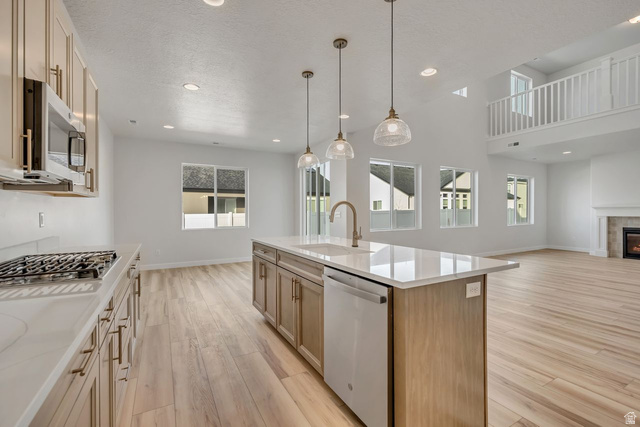 "WOW" starting from the front porch. Professional designer selected finishes-starting with LVP flooring on entire main level. Quartz countertops, accent island and the brand-new Oat color cabinets! Got a practicing chef or baker in the family, this kitchen is second to none! Double wall ovens, 5 burner gas cooktop with pan size drawers below. 14 ft of garage side yard. Pour an RV pad right on your property. Brightest 17 ft wall of windows, loft overlook and so much more to make your own. Ask about low Interest rates = low payments