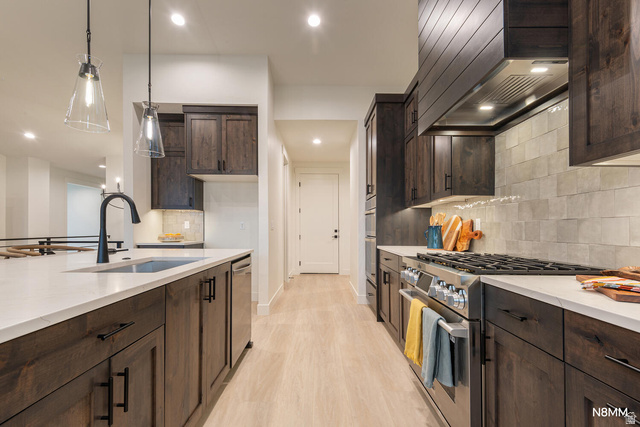 Alta Park is an intimate four-lot enclave located in Sandy, directly across from Alta High School. This beautifully designed rambler offers six bedrooms and four and a half bathrooms with a spacious, functional layout. The primary suite is privately positioned on one side of the home, with two additional main-level bedrooms located near the kitchen-an uncommon design that enhances privacy and livability. Luxury features include a brick fireplace with raised hearth, wood mantle, and built-in cabinetry, a 36" LG Signature gas range, custom cabinetry, quartz countertops, and euro glass showers. The fully finished basement offers comparable upgrades to the main level and additional living space. Enjoy stunning Wasatch Mountain views and convenient access to shopping, parks, schools, trails, and outdoor recreation. This is not a typical builder spec home. Contact agent for details on this home and the others we have to offer there.