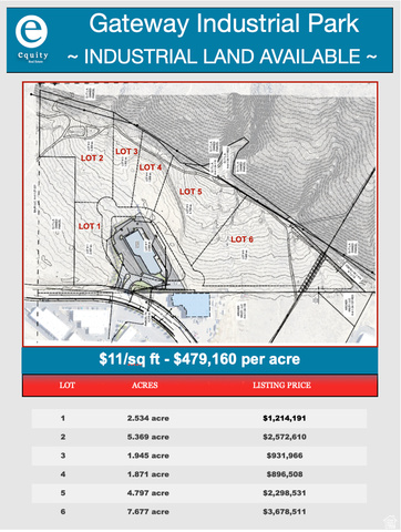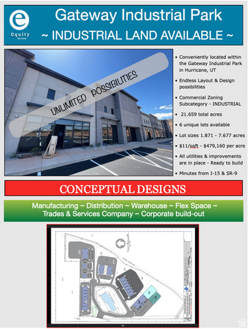 Prime Industrial Land in Gateway Industrial Park Hurricane, UT. Excellent location just minutes from I-15 and SR-9. Six individual industrial lots available totaling 21.659 acres, with lot sizes ranging from 1.871 to 7.677 acres. Offered at $11 per square foot - $479,160/ acre.. Fully improved parcels with all utilities and infrastructure in place and ready for immediate development. Flexible layout and design options make this an ideal opportunity for a wide range of industrial or commercial uses. Whether you're expanding, relocating, or developing, this strategic location offers excellent access, flexibility, and long-term value.