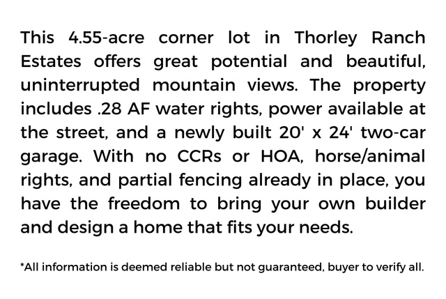 This 4.55-acre corner lot in Thorley Ranch Estates offers great potential and beautiful, uninterrupted mountain views. The property includes .28 AF water rights, power available at the street, and a newly built 20' x 24' two-car garage. With no CCRs or HOA, horse/animal rights, and partial fencing already in place, you have the freedom to bring your own builder and design a home that fits your needs. A great opportunity for a build-ready lot with space, views, and flexibility.