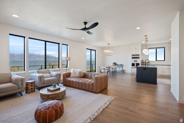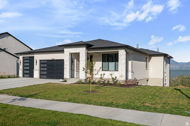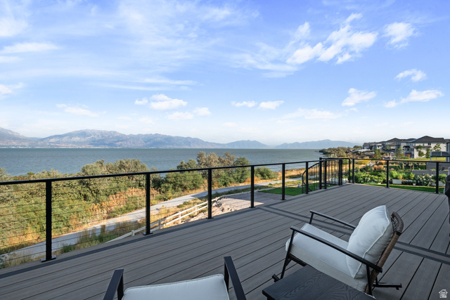 RARE UTAH LAKEFRONT LUXURY. Thoughtfully designed as a high-end rambler, this home delivers elegant main-level living with comfort, accessibility, and timeless style. Extensive custom upgrades throughout reflect a no-expense-spared approach to quality. Outdoor living is extraordinary. Expansive, professionally designed decks frame unobstructed lake and mountain views with no backyard neighbors. A modern spiral staircase connects multiple spaces for entertaining or relaxing, while the backyard offers a rare blank canvas for a custom outdoor sanctuary-ideal for refined landscaping or outdoor entertaining. Interior highlights include Cafe white appliances, custom office cabinetry, a basement kitchenette, two fireplaces, and custom built-ins, and striking inside-out black windows that create a clean, modern aesthetic. The primary suite showcases stunning lake and mountain views, a spa-inspired bath with a separate tub and shower, and a fully customized walk-in closet. Additional features include modern top-down, bottom-up window coverings, premium water softening and filtered drinking water systems on both floors, a finished garage with epoxy flooring and EV-charging, and exterior conveniences such as an outdoor BBQ gas line and hot tub outlet. Move in now and enjoy lakefront living from day one. Opportunities like this are limited, making it an exceptional option for buyers seeking a true waterfront lifestyle. A fully furnished option is available at the right price, and special mortgage savings may be offered to qualified buyers.