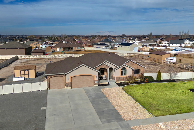 This great rambler sits on 1.14 acres of horse-friendly property and gives you plenty of room to spread out. The property includes a large four-car garage with RV parking, is fully fenced, and comes with two water shares, adding both practicality and value. Inside, you'll find five bedrooms and four bathrooms across an almost 4,000 square foot, open and bright floor plan that invites natural light and easy living. Notable features include a mini movie theater for entertaining, a central back laundry on the main floor for everyday convenience, and a basement that is plumbed for a second kitchen, offering flexible possibilities for guests, in-law arrangements, or rental income potential. The home's thoughtful upgrades and layout balance comfort with functionality. Situated in a great community, you'll enjoy convenient access to schools, shopping, entertainment, and restaurants, while still enjoying a peaceful setting. Don't miss this opportunity to own a versatile, spacious home in a desirable location.